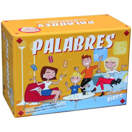 Jeu de lettres et de rapidité à l’oral. On découvre 3 cartes lettres sur la table, une de chaque paquet. Pendant 1 minute 15 tous les joueurs cherchent des mots qui utilisent ces 3 lettres de gauche à droite ou de droite à gauche, en ajoutant autant de lettres que nécessaire, au début, au milieu ou à la fin du mot. A chaque mot correct le joueur gagne un pion jaune. Quand le temps est écoulé, celui qui a le plus de pions reçoit 1 pion bleu. Palabres est facilement modulable, il permet de travailler le vocabulaire et il est très amusant à tout âge!